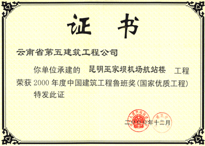 昆明建設(shè)局2000年度先進(jìn)企業(yè)